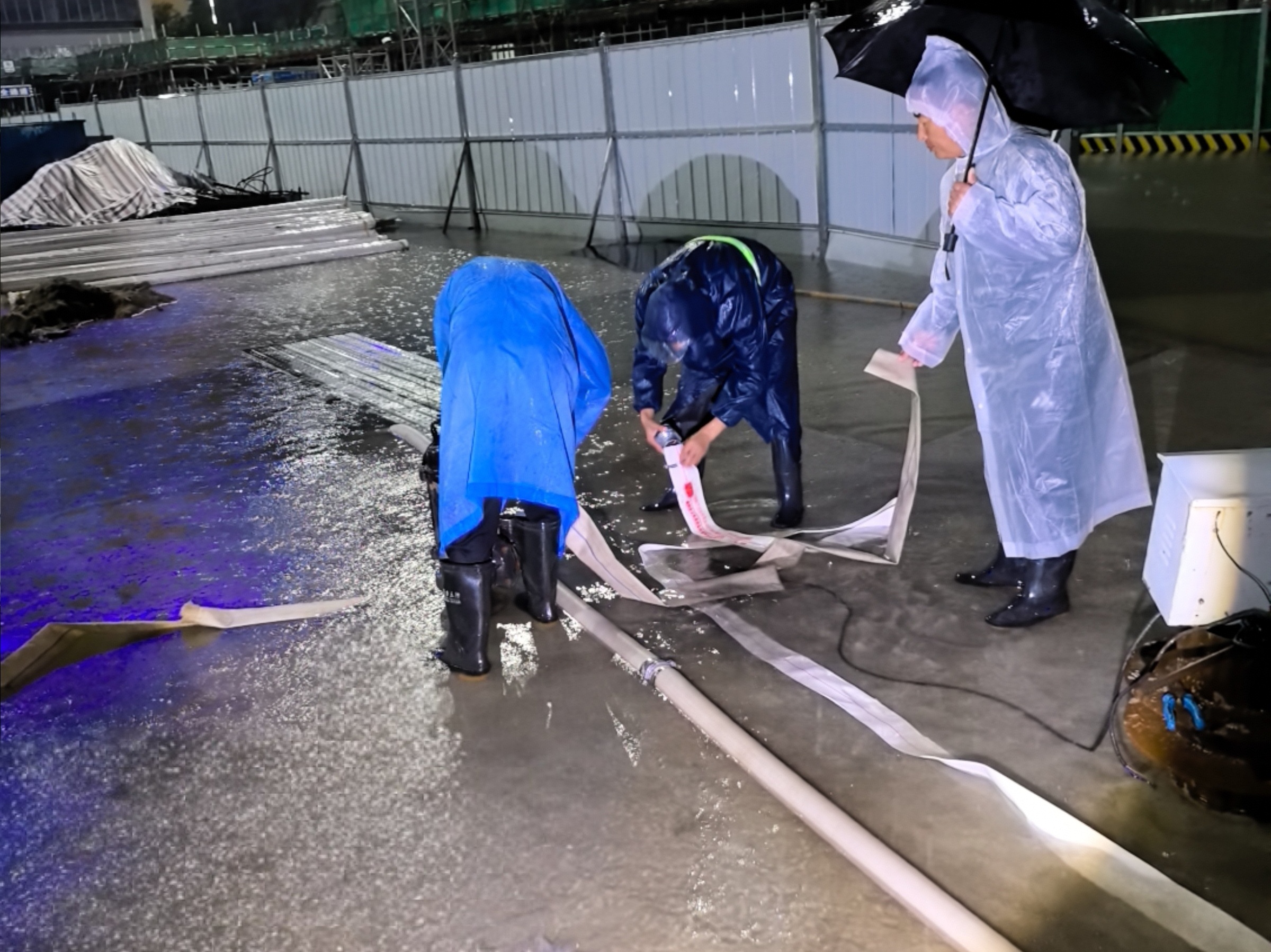 針對施工區域積水問題,在低洼區域布設便攜式抽水泵、電纜卷盤、照明工具,確保突發狀況下能夠迅速排水,最大限度降低降雨影響。此外,強化高空墜物風險管理,對塔吊、腳手架、臨時圍擋進行全面加固,嚴格管控腳手板、鋼筋、小型物件存放安全,切實防止雷雨大風天因高空墜物引發安全事故。