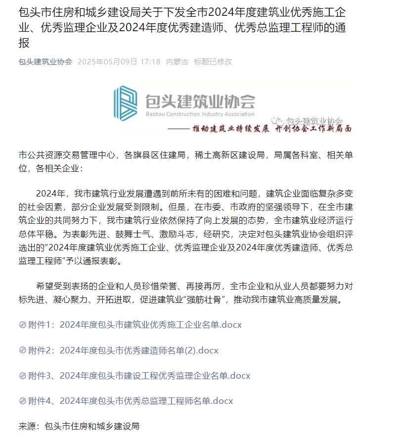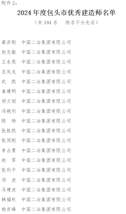 近日,包頭市住房和城鄉建設局通報表彰了全市2024年度建筑業優秀施工企業、優秀監理企業及2024年度優秀建造師、優秀總監理工程師中國二冶獲評“2024年度包頭市建筑業優秀施工企業”,同時30名職工獲評2024年度包頭市優秀建造師為公司榮譽榜再添佳績。