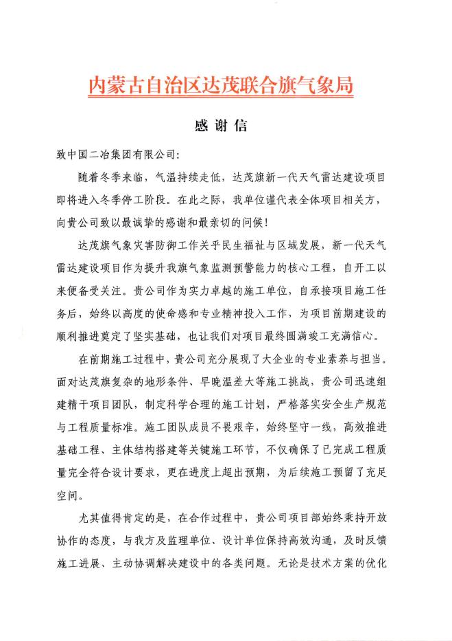 11 月 16 日,中國(guó)二冶收到內(nèi)蒙古自治區(qū)達(dá)茂聯(lián)合旗氣象局發(fā)來(lái)的感謝信,信中對(duì)公司在達(dá)茂旗新一代天氣雷達(dá)建設(shè)項(xiàng)目施工中的專業(yè)表現(xiàn)與辛勤付出給予高度肯定,并致以誠(chéng)摯感謝。