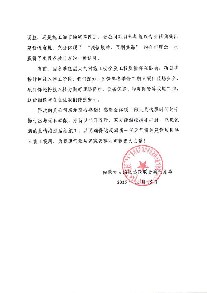 合作期間,項(xiàng)目部始終秉持開放協(xié)作態(tài)度,與氣象局、監(jiān)理單位及設(shè)計(jì)單位建立高效溝通機(jī)制,及時(shí)反饋施工進(jìn)展,主動(dòng)協(xié)調(diào)解決建設(shè)中的各類問題。同時(shí),在技術(shù)方案優(yōu)化、施工細(xì)節(jié)完善等方面積極提出建設(shè)性意見,切實(shí)踐行 “誠(chéng)信履約、互利共贏” 的合作理念,贏得了項(xiàng)目各參與方的一致認(rèn)可。針對(duì)冬季低溫天氣對(duì)施工安全及工程質(zhì)量的影響,項(xiàng)目部還細(xì)致部署現(xiàn)場(chǎng)防護(hù)、設(shè)備保養(yǎng)、物資保管等冬季停工收尾工作,盡顯嚴(yán)謹(jǐn)負(fù)責(zé)的工作態(tài)度。 此次感謝信的送達(dá),極大鼓舞了項(xiàng)目部全體人員的士氣,既是對(duì)中國(guó)二冶高質(zhì)量管理與實(shí)干擔(dān)當(dāng)?shù)某浞终J(rèn)可,也為團(tuán)隊(duì)注入了強(qiáng)勁動(dòng)力。