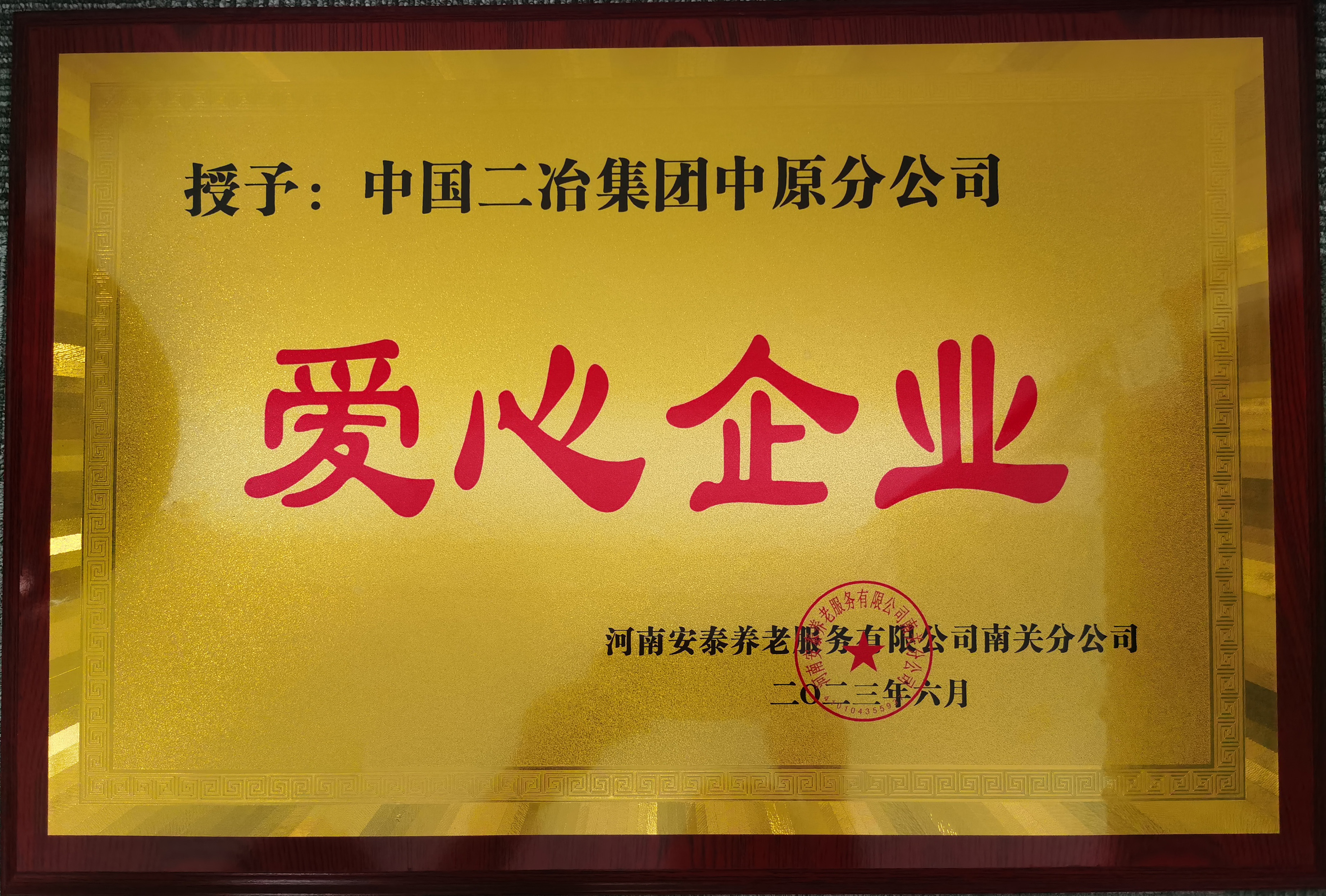 涓涓細(xì)流可匯成海,綿薄之力可筑城墻。6月27日,中國二冶集團(tuán)中原分公司收到來自鄭州市青少年宮、鄭州市河南安泰養(yǎng)老服務(wù)有限公司管城分公司兩家單位頒發(fā)的“愛心企業(yè)”榮譽(yù)牌匾。